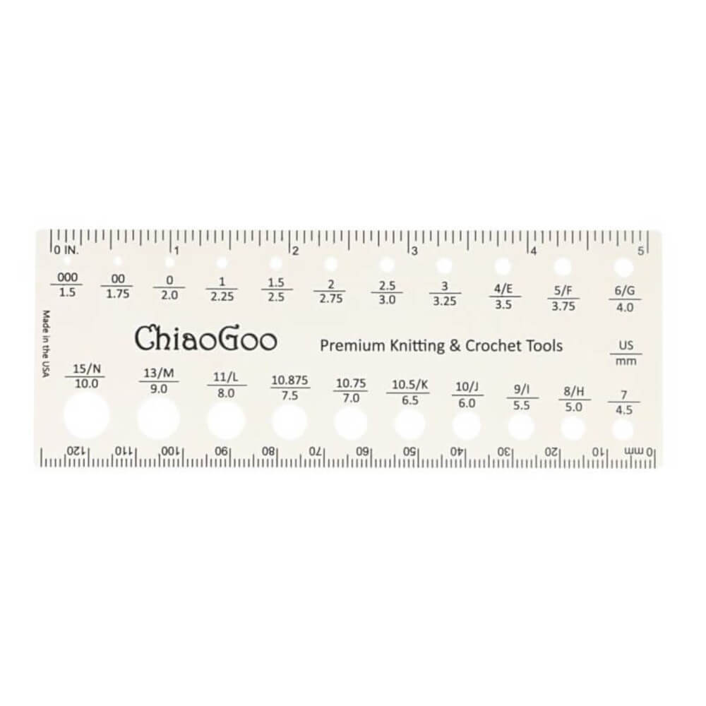 Il Misuratore di Ferri ChiaoGoo è uno strumento indispensabile per chi lavora a maglia, ideale per determinare con precisione la dimensione dei ferri e misurare i campioni di lavoro.