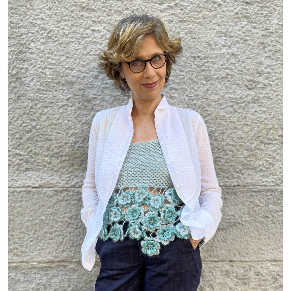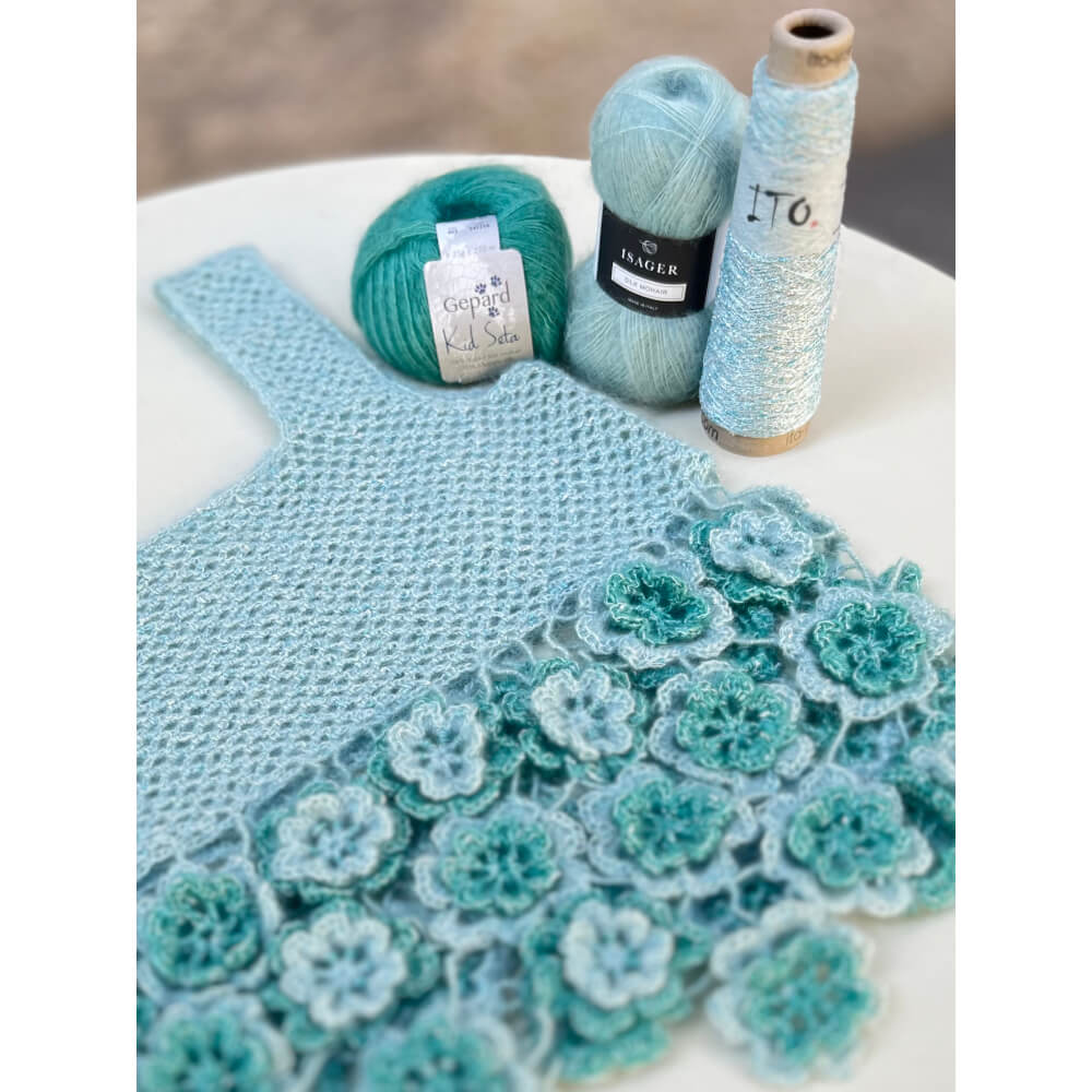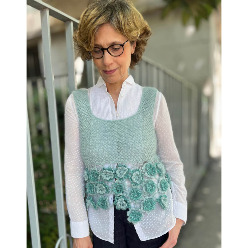 La canotta ha un ampio scollo quadrato, larghe spalline e una baschina ottenuta unendo fra loro rose d’Irlanda di misure diverse.