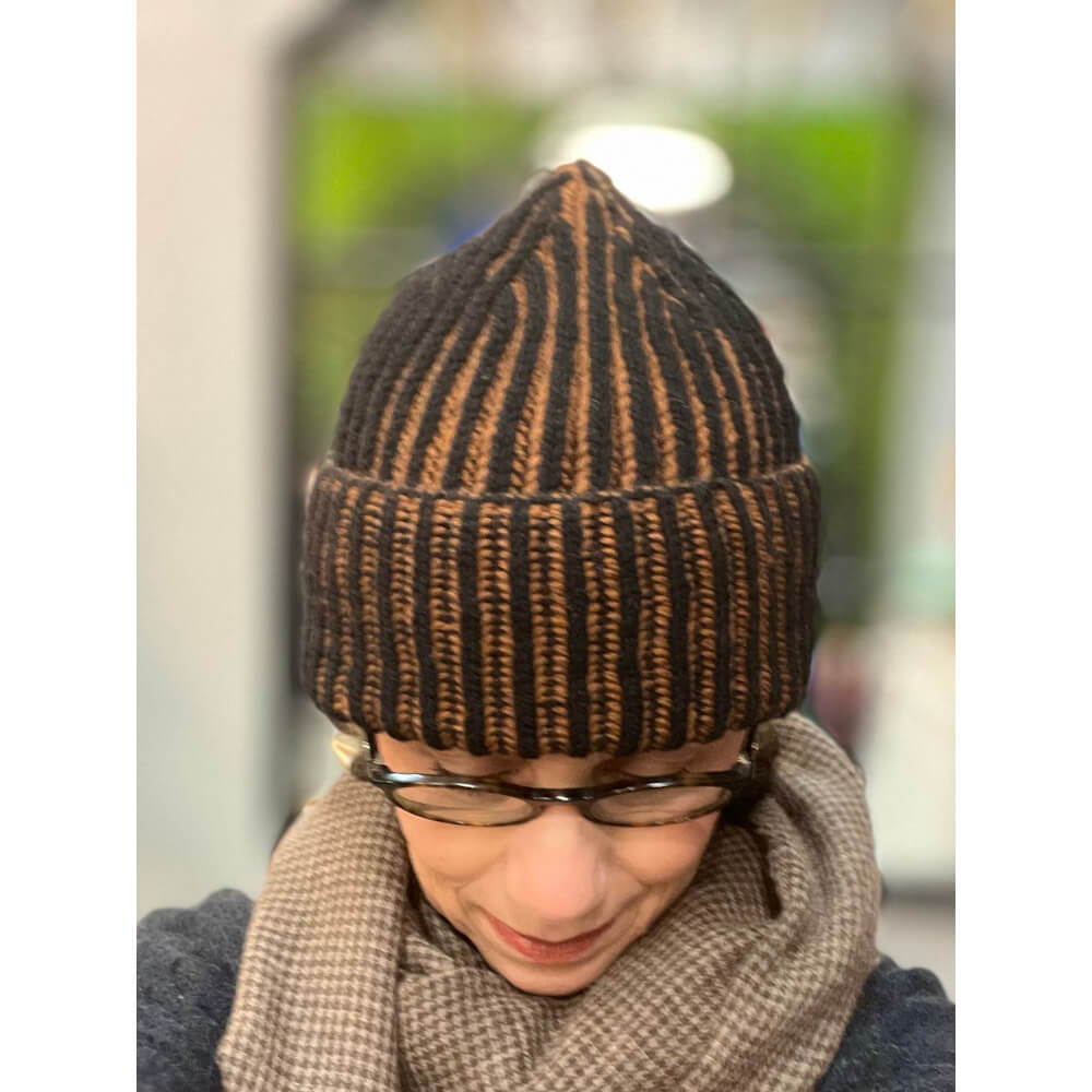 - Il cappello unisex “Two by Two” di Anne Gagnon, lavorato a coste 2/2 con i ferri circolari;